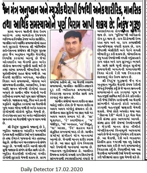 Daily Detector न्यूज पेपर में जैन अनुष्ठान म्युजिक थेरेपी का 17 02 2020 का विशेष अहेवाल