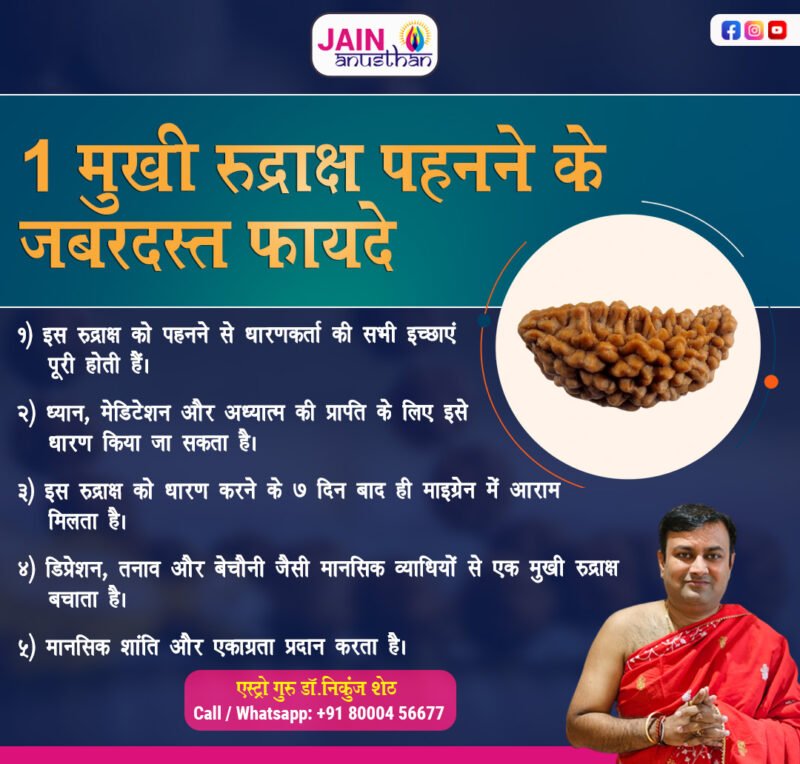 • ➥ डिप्रेशन, तनाव और बेचैनी जैसी मानसिक व्‍याधियों से एक मुखी रुद्राक्ष बचाता है।