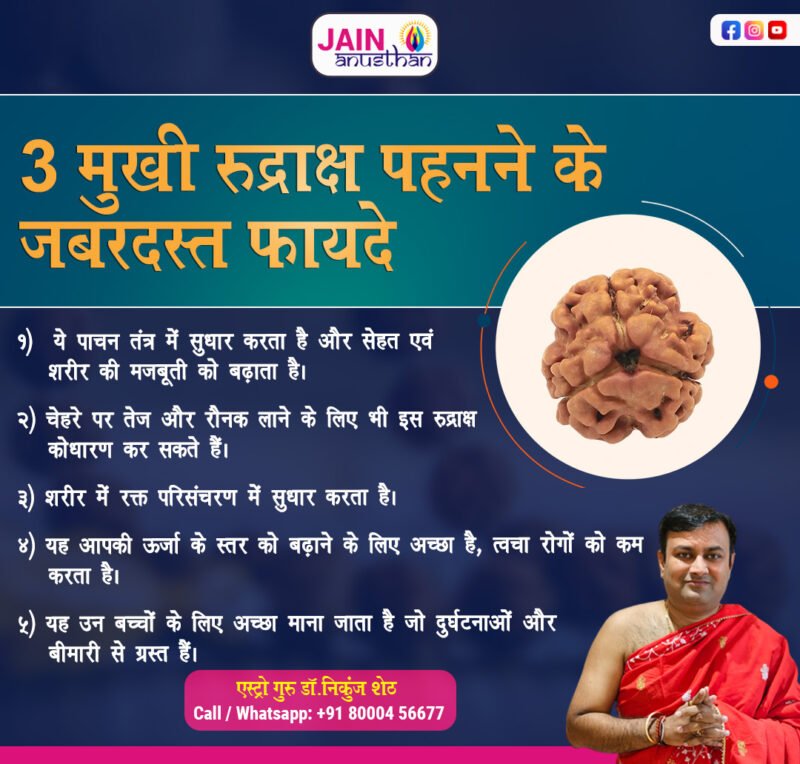 - तीन मुखी रुद्राक्ष का एक मन और शरीर पर सुखदायक प्रभाव पड़ता है।