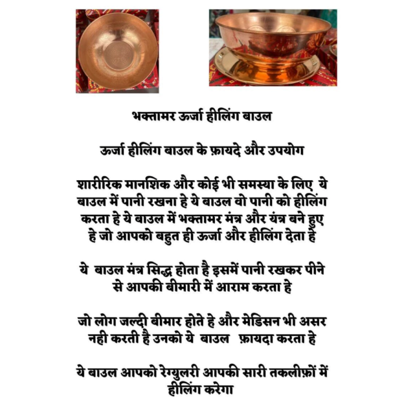 शारीरिक मानसिक और कोई भी समस्या के लिए ये बाउल में पानी रखना है, ये बाउल वो पानी को हीलींग करता है, ये बाउल में भक्तामर मंत्र और यंत्र बने हुए हैं, जो आपको बहुत ही उजाॅ और हीलिंग देता है ।ये बाउल मंत्र सिद्ध होता है इसमें पानी रखकर पीने से आपकी बीमारी में आराम करता है ।